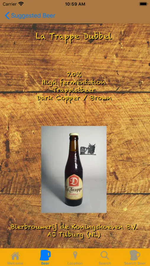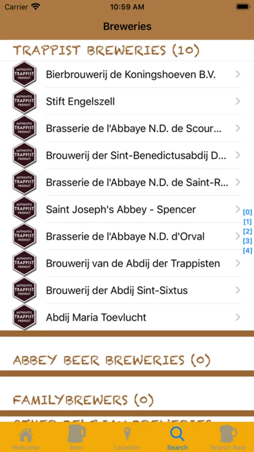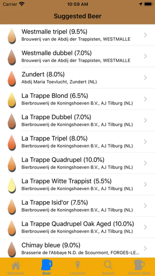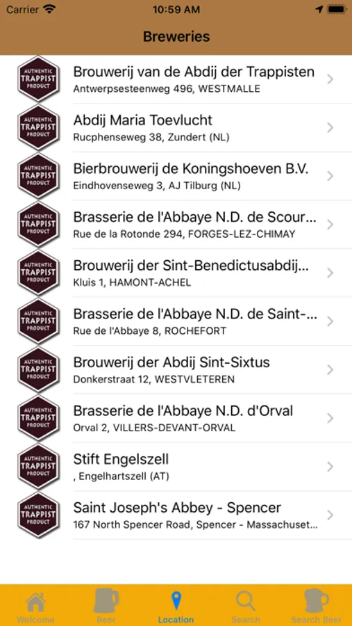 Find a brewery by using the city or village name as a search word (or start of the name like antw for antwerpen) in the Search tab or use the Location tab to find the breweries in order of distance to your current position.