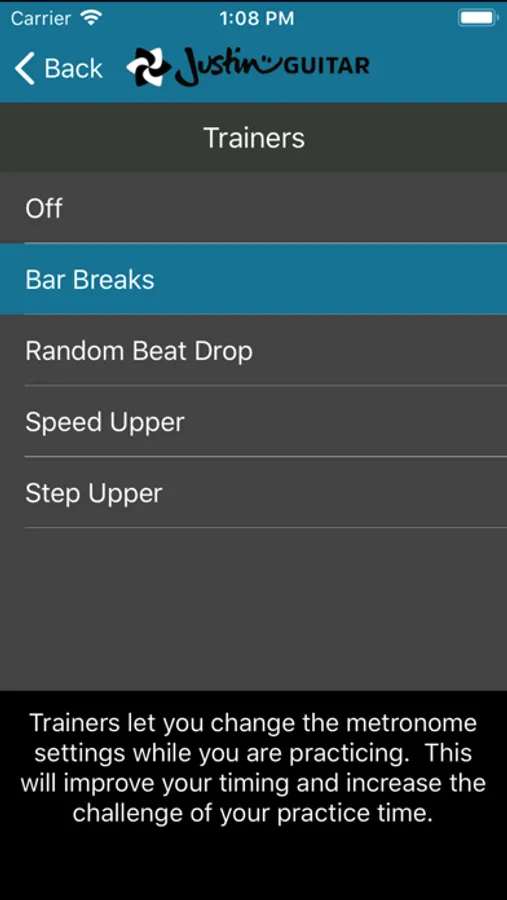 • Bar Breaks • will mute the metronome for a bar or more forcing you to keep your time solid and be perfectly synchronized when the clicks return! This is a superb exercise and will really help develop confidence in holding your tempo. You can adjust how many bars are solid at the start then how many bars are solid and how many bars are muted which will cycle for the duration of the session. You can also select "random" mode and a % of bars (that you set) that will be dropped for an even more challenging practice session!