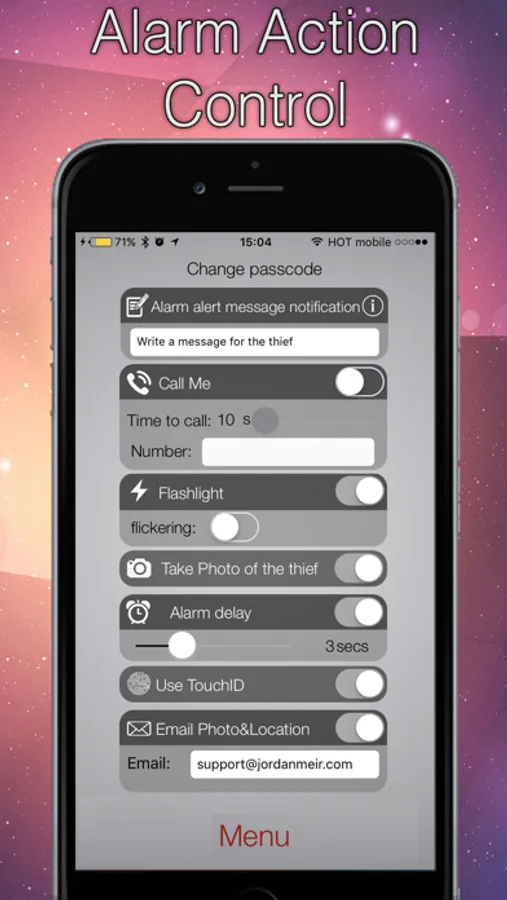 After the alarm was activated it will give you 5 secs deactivate it, if after 5 secs it not deactivate this option will take 2 photo from the front camera,