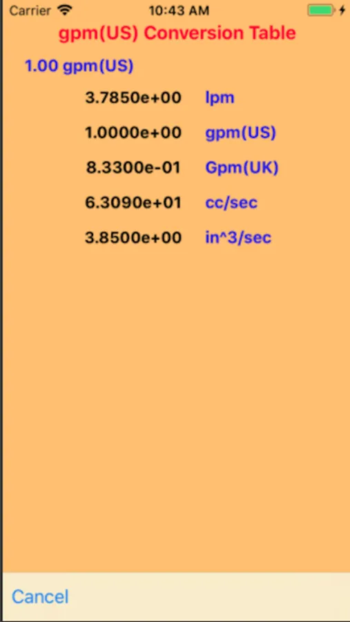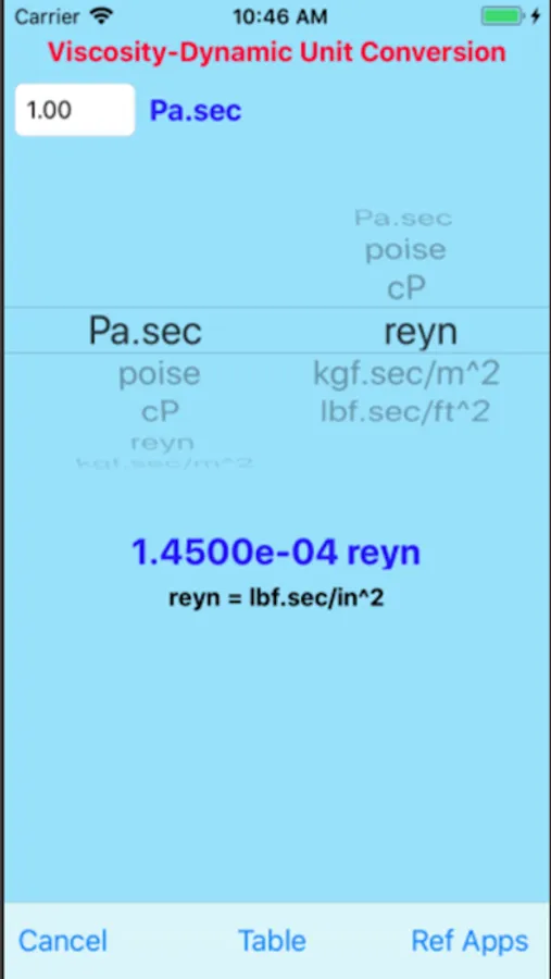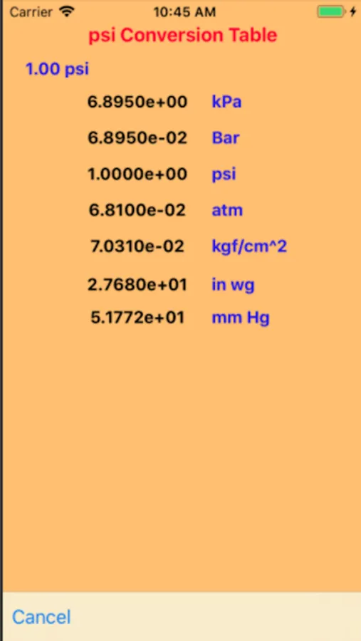 By default, the app provides the conversion factor for units listed above. However, users can enter in any data and then convert its value in the chosen unit from the picker. In addition app generates a conversion table for the chosen unit. The following screen shots illustrate this for pressure as an example.