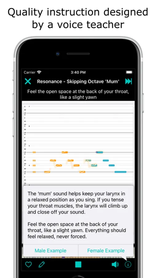 With Erol Singer’s Studio, we defined a new genre of vocal training software starting in 2012, and have improved it year after year with your feedback and our own ideas. Patented at its core, the app comes with a complete set of lessons organized into progressive levels designed by an award winning singer and vocal coach, best in class super-smooth pitch tracking technology that’s a joy to use, and an optional built-in exercise editor for those who’d like to add their own patterns/song-snippets for practice. But don’t take our word for it; download for free¹ and see for yourself.
