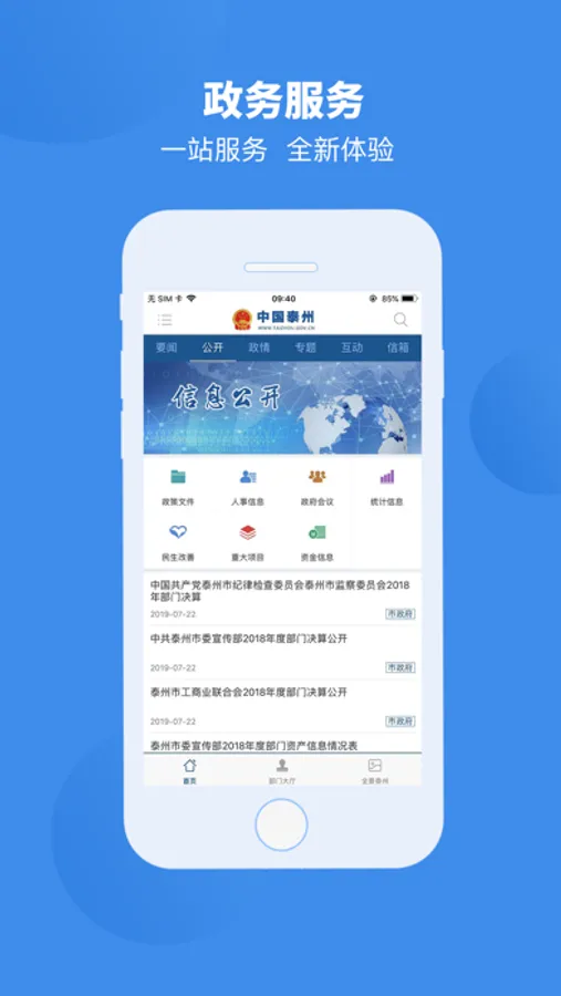 泰州市政府网站微门户,能够及时发布网站的最新信息,内容包含政府版块、信息公开、公民版块、企业版块、互动版块,支持微博推送分享、个性化订阅等功能,为公众提供更快捷的服务