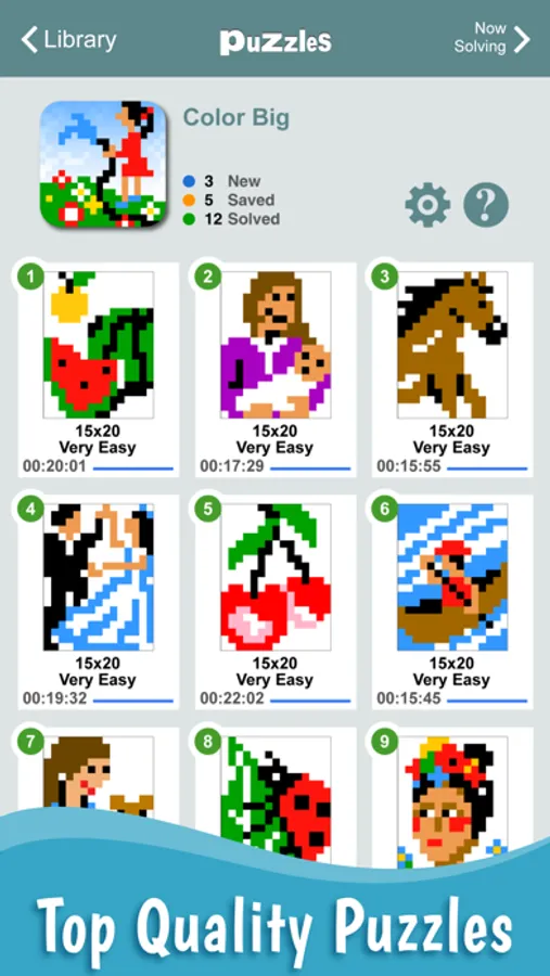 To help see the puzzle progress, graphic previews in the puzzle list show the progress of all puzzles in a volume as they are being solved. A Gallery view option provides these previews in a larger format.