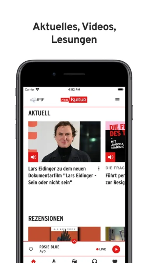 Auf der Startseite der App finden Sie den Livestream, unsere Lesung, Konzerte zum Nachhören, Videos sowie die aktuellen Audios mit Gesprächen, Buchrezensionen, Konzert- und Theaterkritiken, CD-Tipps und Beiträgen aus der Welt der Kultur.