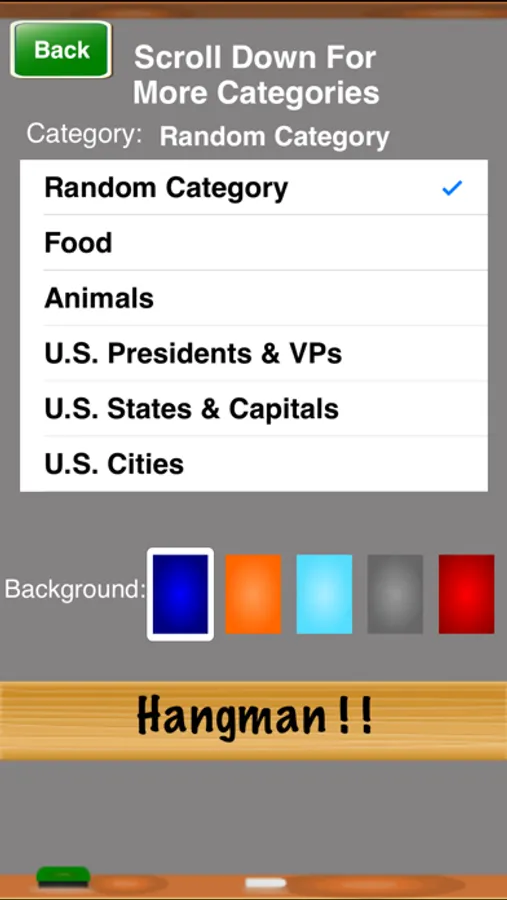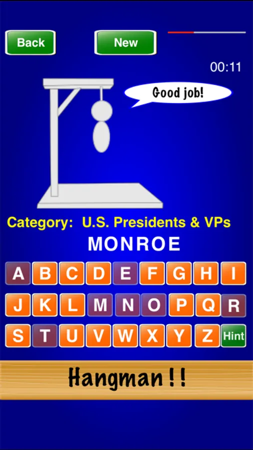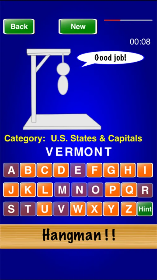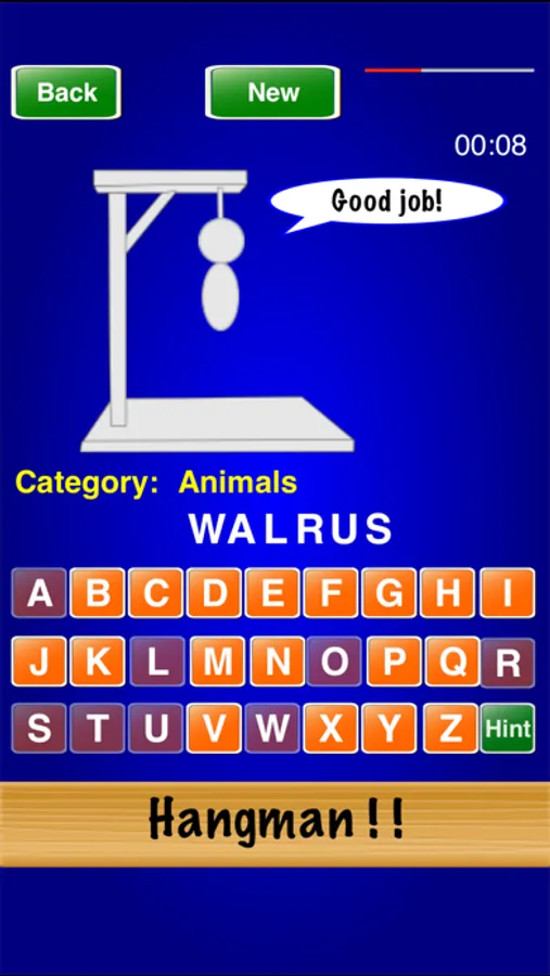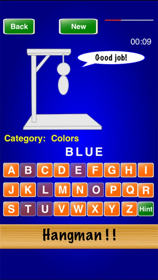 Hangman ! ! is a great way to test your vocabulary skills and have fun at the same time. Select the category in the "Settings" screen. If you need help with a word, press the "Hint" button.