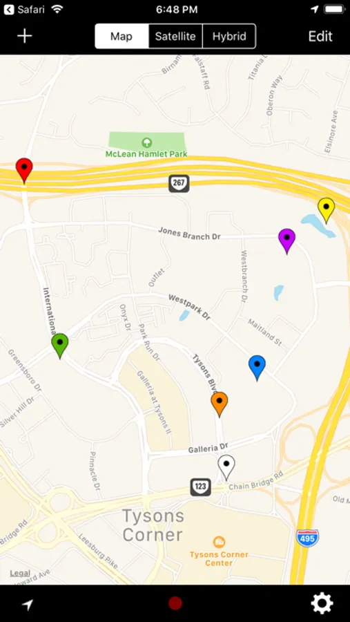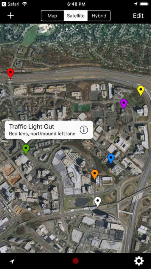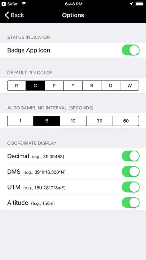 Tap the record button to automatically create new Placemarks at the interval set on the Options screen. While the record button flashes, the app will continue to collect Placemarks in the foreground or background. Tap the record button again to stop collecting location data.