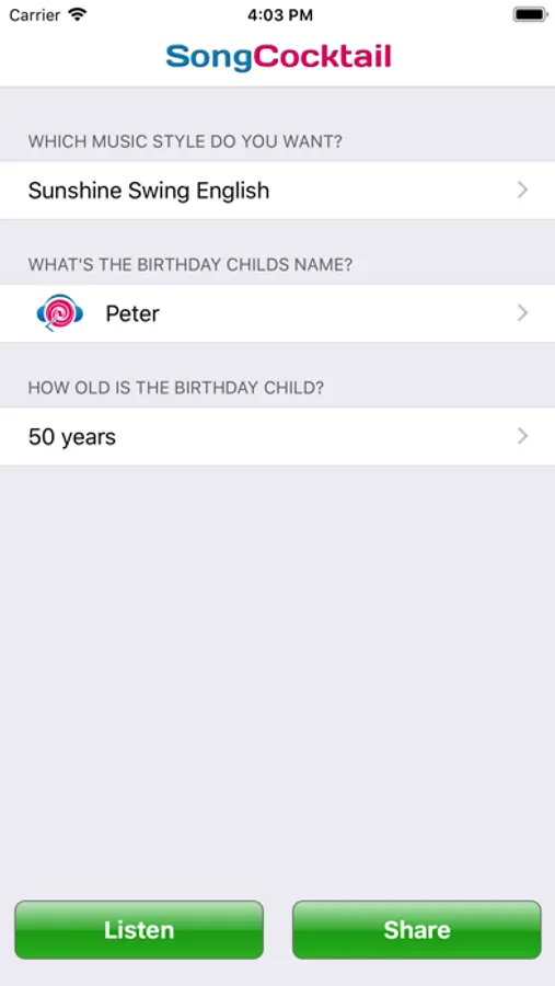 You want to wish your girlfriend, boyfriend, mom, dad, grandma or grandpa a happy birthday? No problem. Using SongCocktail you can send a birthday song matching their name and age.