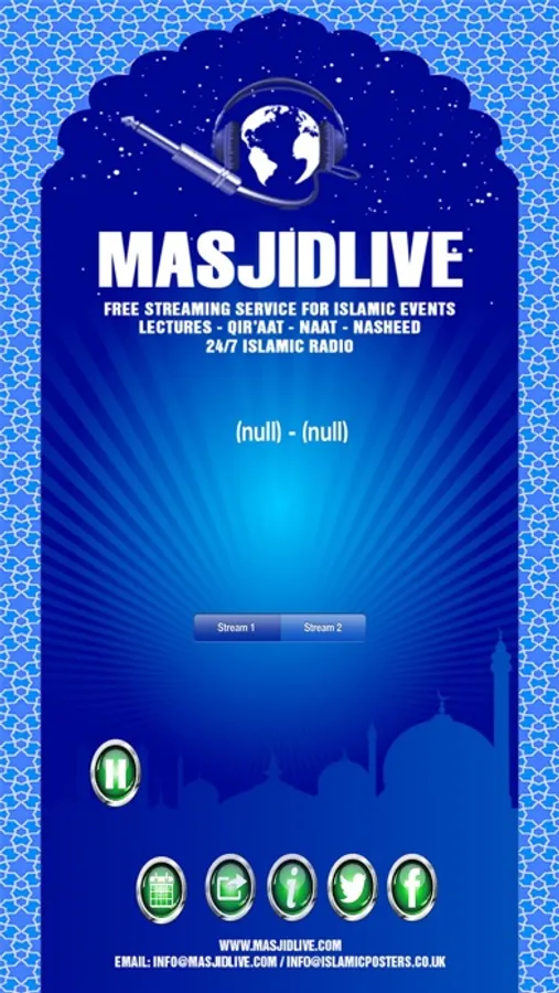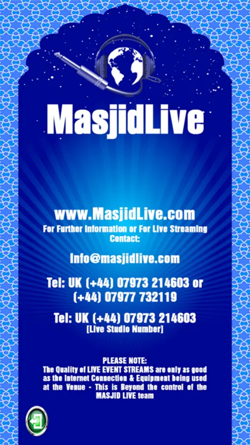 Masjid Live – Your 24 Hour Islamic Radio & Live Event Streaming Service Provider. Where you can listen to Islamic Speeches, Nasheeds, Naats and beautiful recitation of the Holy Qur’aan. You can also listen to LIVE LECTURES broadcasted from Venues and Masjids All over the world.