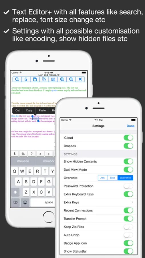 - Edit Rich Text and Plain Text files with built-in Advanced Text Editor (.rtf .txt, .text, any text file)