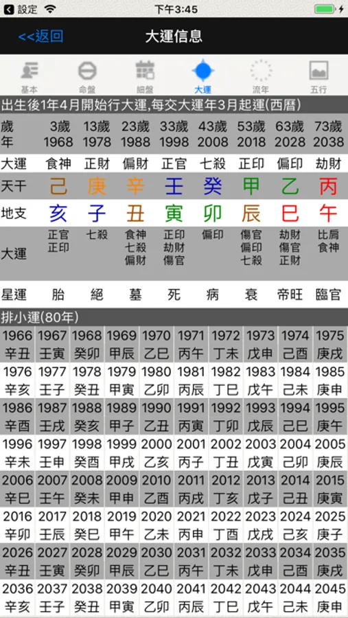 -- 強大實用的細盤功能,大運和流年互相關聯,點擊大運流年可以互動大運未起以小運代替,小運和流年互相關聯;