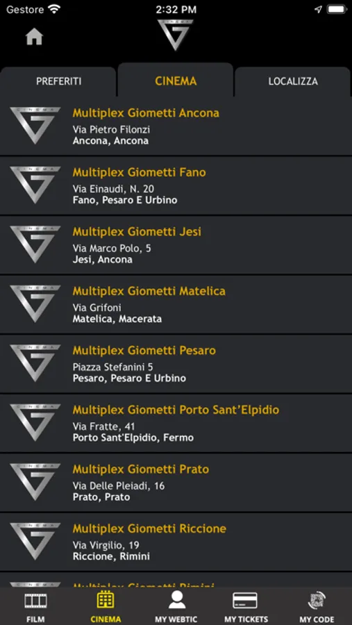 Applicazione di Crea Informatica, per l'acquisto e la prenotazione dei posti nel Circuito cinematografico Giometti Cinema, distribuito su più regioni italiane.