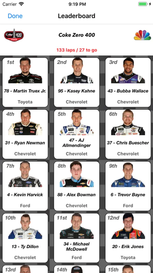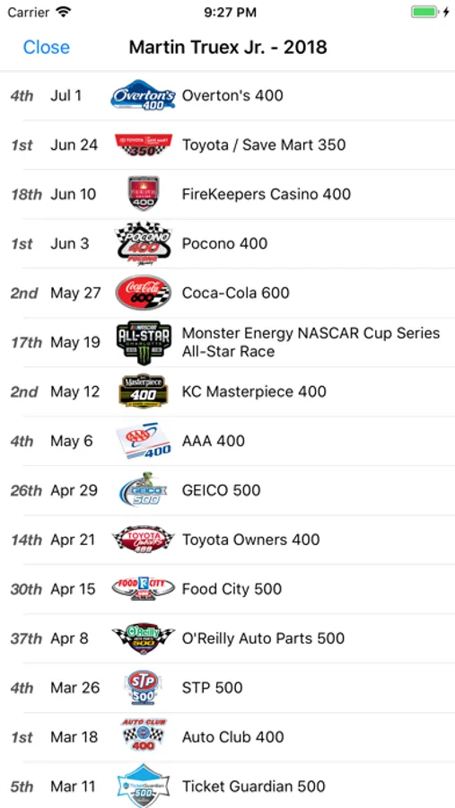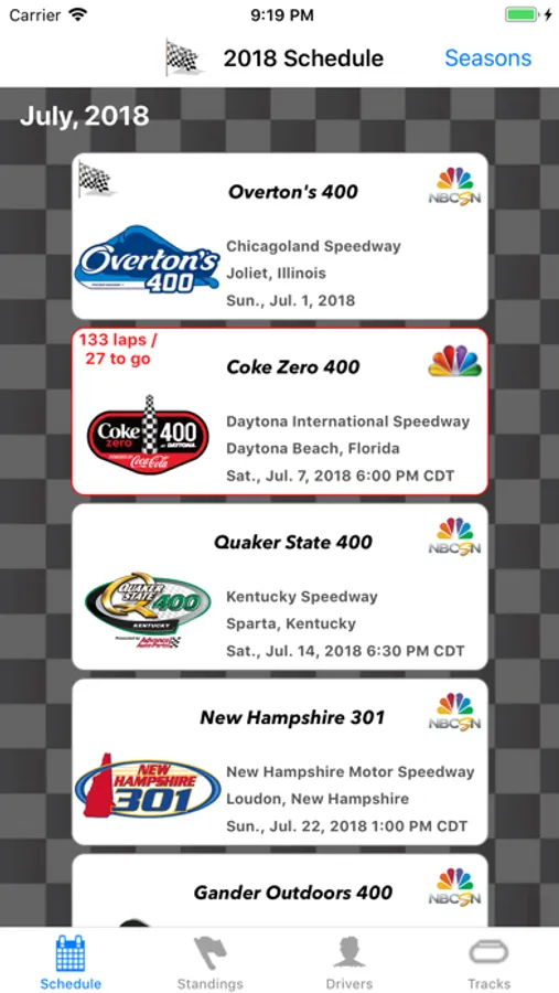 Provides single click schedule and standings for the NASCAR Cup Series.