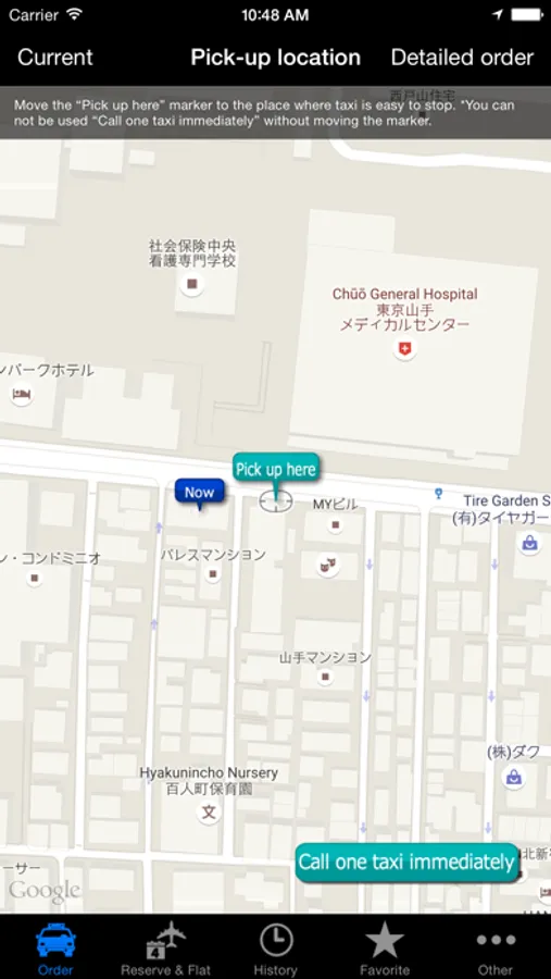 1. You can specify the pick-up location for a taxi by using a map. Taxis can be ordered from within the 23 wards of Tokyo along with Musashino and Mitaka cities.