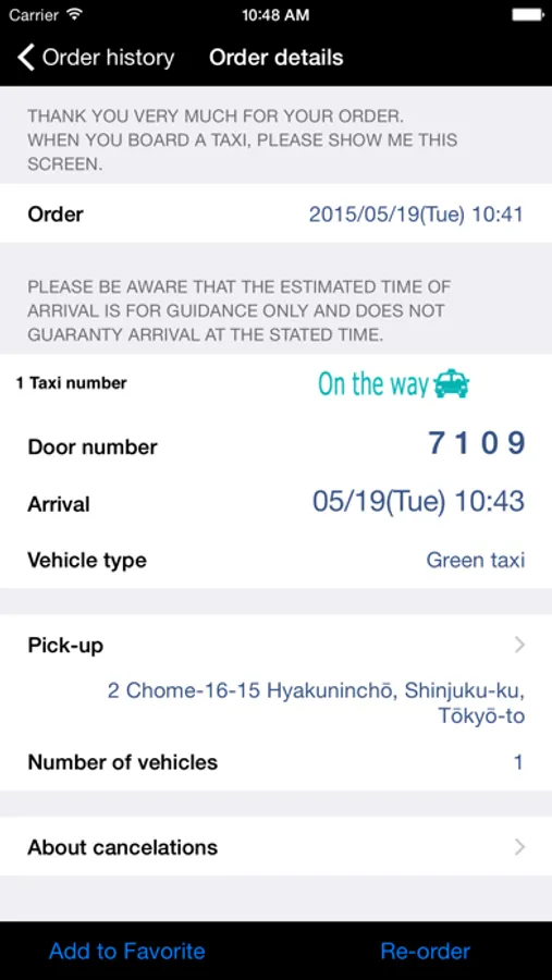 3. When you use this application to order a taxi, a pick-up charge of 320 yen will be added to the meter fare in the same way as when an order is placed by telephone.