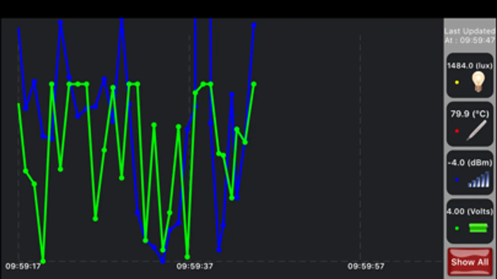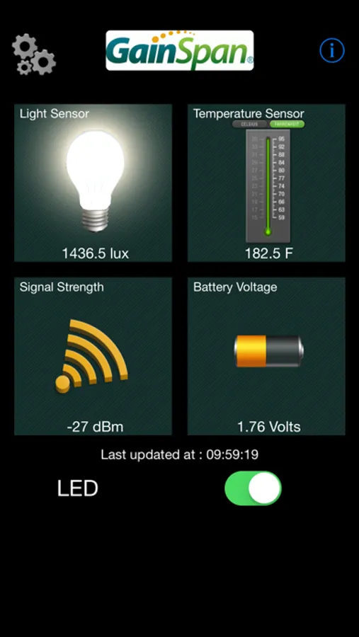 This application works in conjunction with Gainspan's EVK and displays the values of the temperature and light sensor on the board. It also displays the signal strength and battery voltage. When the mode is changed to landscape, it graphs the various parameters as they change in time. This Application requires an actual hardware device to work with.