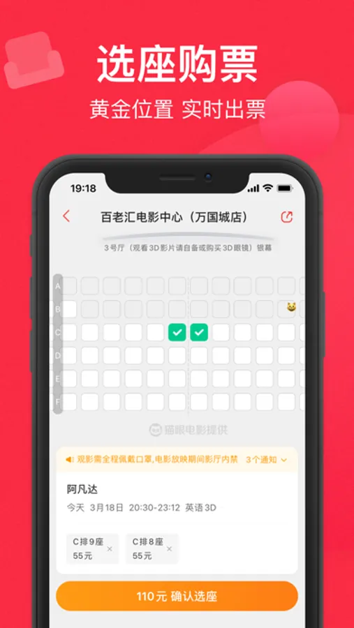 覆盖全国 7000+ 家影院,实时查询放映场次,提前选好座不排队