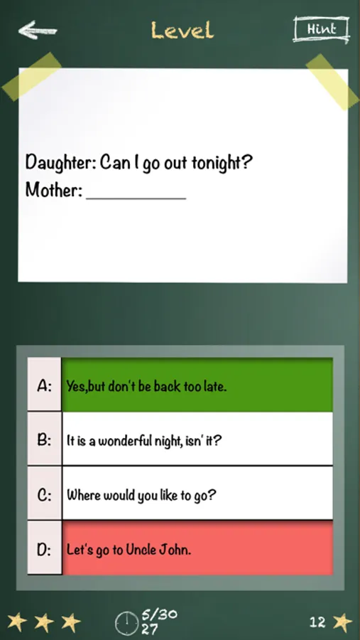 Playing is very easy. First, choose a level (Beginner, Intermediate or Advanced) depending on your English knowledge. Then, tap the correct answers for each question beginning from the first level. If a question is difficult to answer, you can use "Hint" option to remove some wrong answers.
