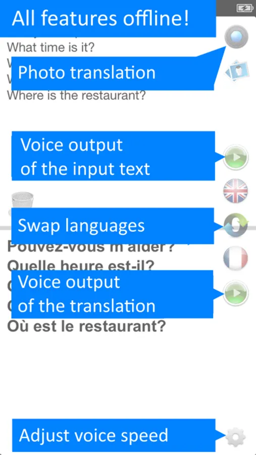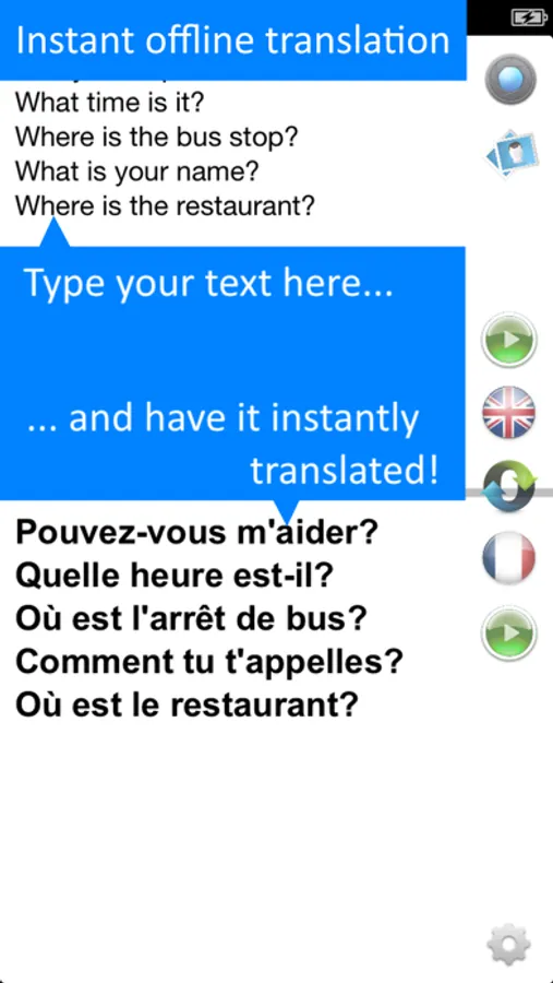 Translate sentences of text without data connection between English and French in offline mode. A must have if you travel to foreign countries - do not rely on Internet and save on data roaming charges!