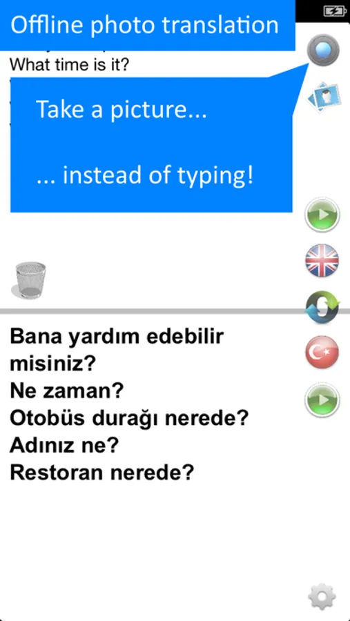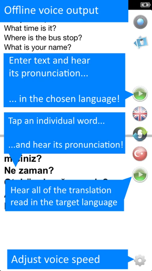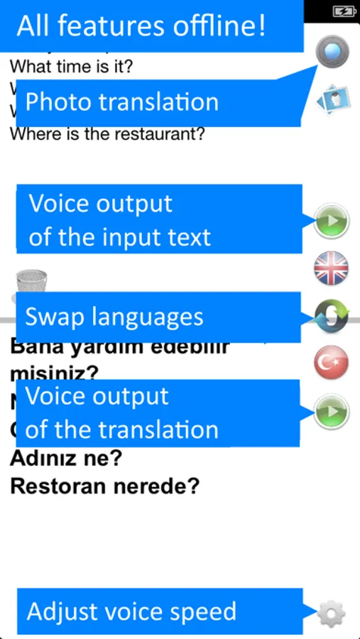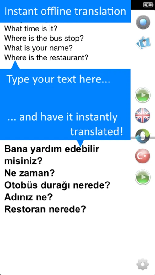 OFFLINE translator and dictionary -- the ultimate foreign language tool when you are abroad! Translates text between English and Turkish. Save on data roaming charges when you travel!