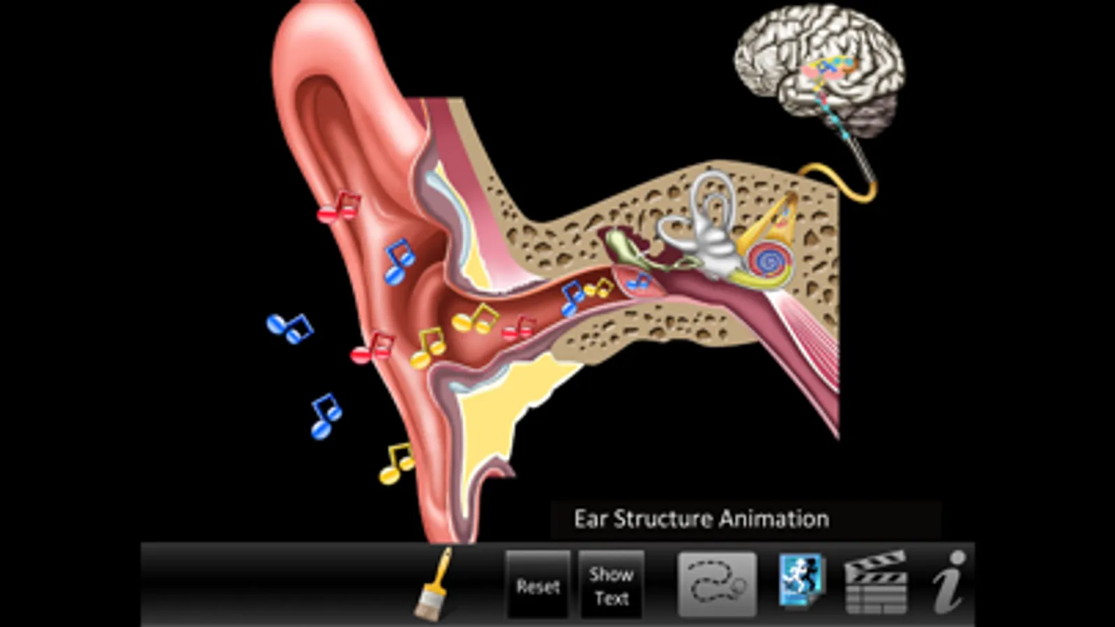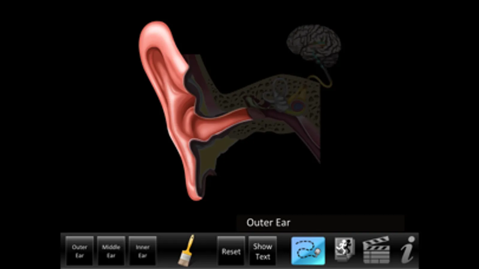 • Structure ID: as each part is touched, the part highlights and the name and description text changes. There are 26 structure parts. Description text shows or hides on demand. Includes touch buttons to view outer, middle and inner ear structures.