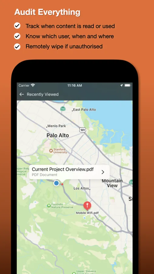 • Maintains complete enterprise control over policies to control ability to read, transfer, edit, email, open in, print and share documents on mobile devices