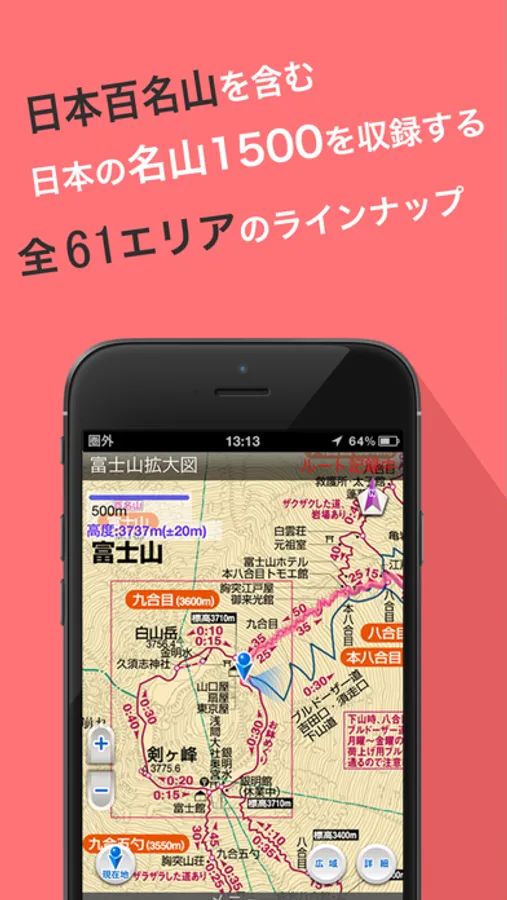 「山と高原地図」全61点をアプリ化。北は北海道から南は屋久島まで日本百名山全山を含む日本の名山約1500を収録します。