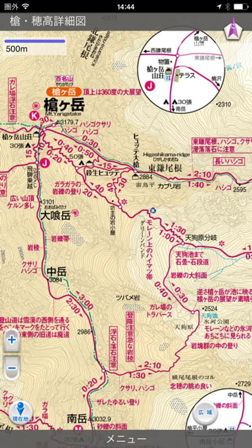 GPSを使って、「山と高原地図」の地図上で自分の位置がわかるから安心。