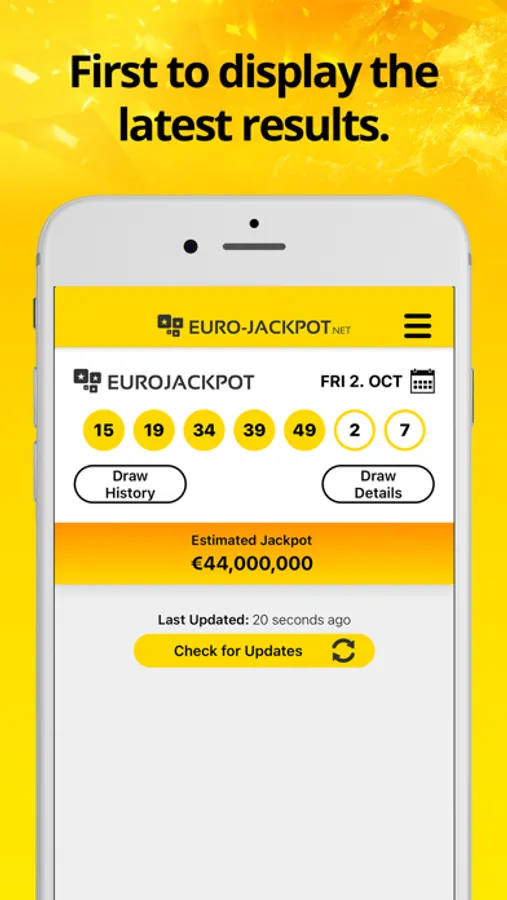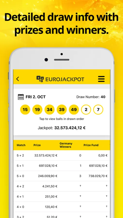 Get the latest Eurojackpot results within seconds of the draw taking place. This easy to use app shows the Eurojackpot numbers (including associated draws like Joker) and full prize breakdowns including number of winners and prizes paid.