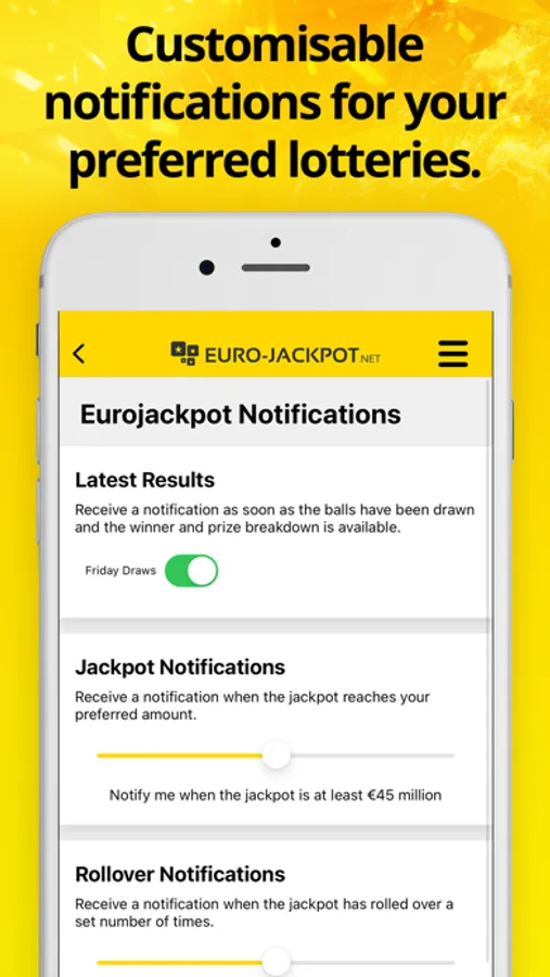 Get notified instantly when the latest Eurojackpot results and prize breakdowns become available. Want to know when the jackpot has rolled over or has reached a certain amount? Just head to the Notification section of the app to set up your alerts. There is also the option to set notifications at times that suit you - great for reminding you to purchase tickets before the draw.