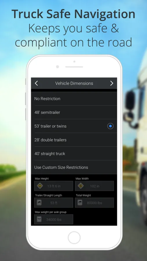 To find out more about the maximum dimensions for your RV navigation, visit our support center support.copilotgps.com (height 14ft, width 102in, total length 45ft, weight 26,000lbs).