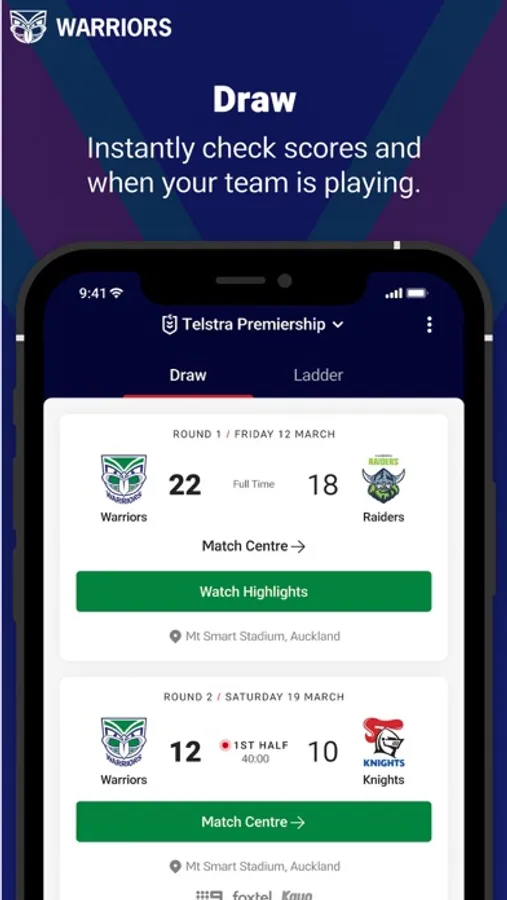 Welcome to the brand new Official New Zealand Warriors app. Our completely redesigned experience gives you access to your favourite team and favourite players - plus you'll get breaking New Zealand Warriors news, live scores, stats, game day information and match highlights. It's everything you need to know about the New Zealand Warriors, no matter where you are.