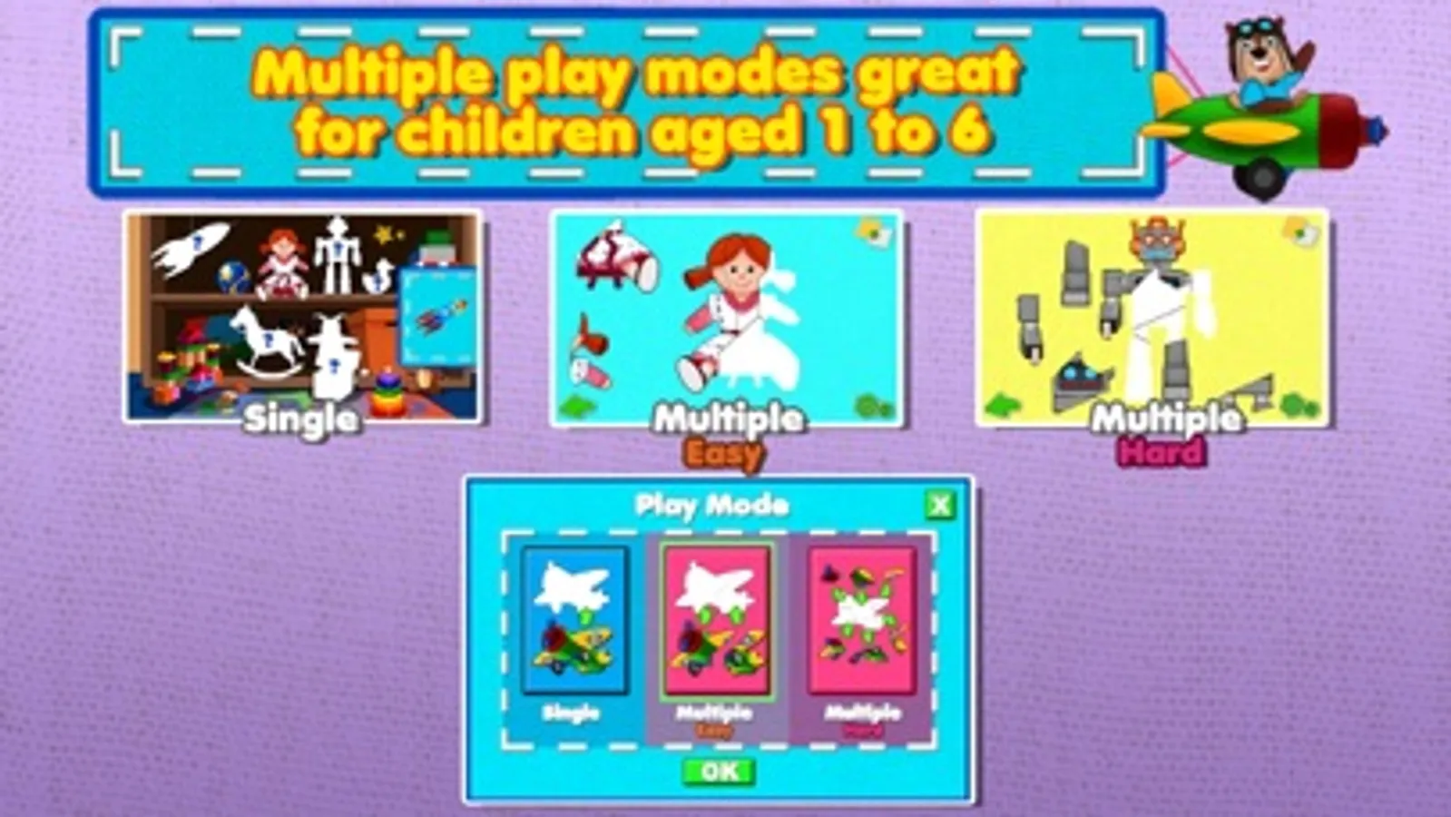 - Multiple play modes to choose from, including a basic shape-fitting mode, an easy mode with 2-4 piece puzzles and a hard mode with 7-10 piece puzzles.