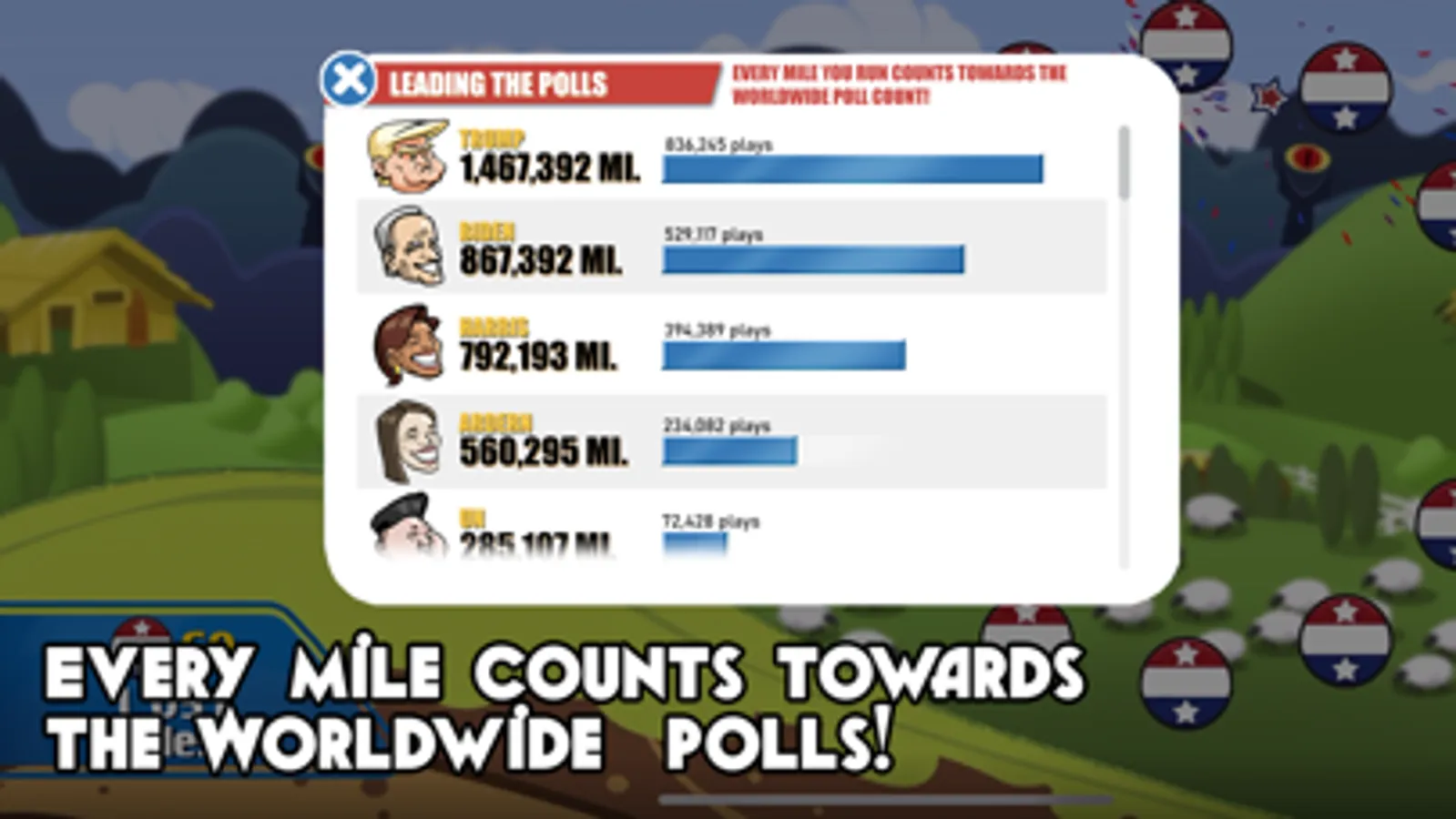 Every mile counts and included in the POLLS, so play often to keep your favorite candidate ahead of the race and collect boosts to help you run farther.