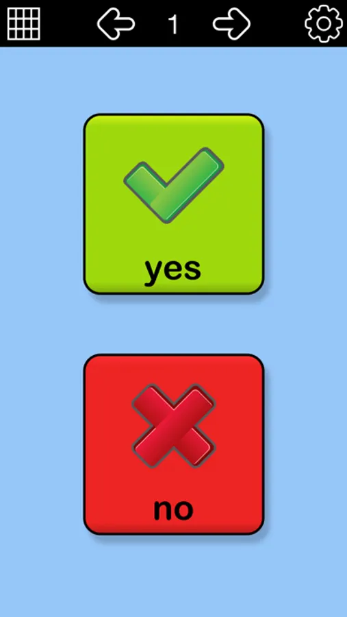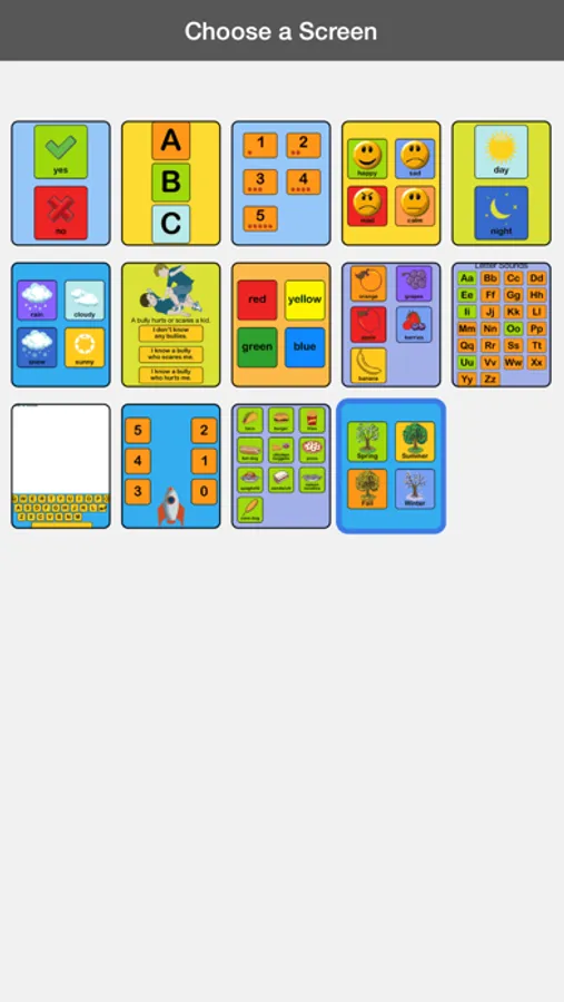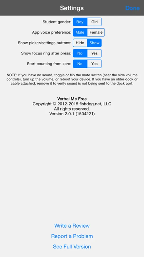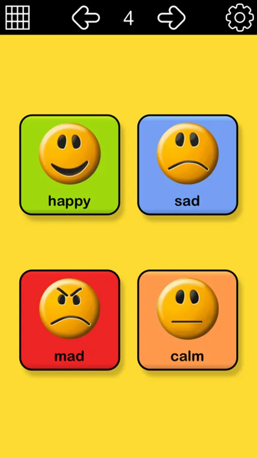By default, left- and right-arrow buttons allow students to switch screens. Optionally, the screen-switching buttons can be hidden and the adult switches screens by sliding one finger from the upper right to the lower left of the screen. Choose one of 18 screens and girl or boy voice. On the Settings screen, there is a link to the full version Verbal Me app with over 100 screen choices. A Spanish-language version is also available.