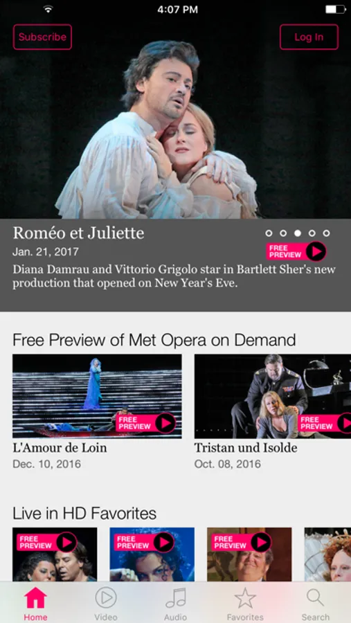The Met Opera on Demand iPad/iPhone app is free to download. Explore the app and the catalog, and enjoy a sampling of free preview content. Now you can sign-up for the 7-day Free Trial or purchase a subscription right inside the app for complete and unlimited access to everything available.