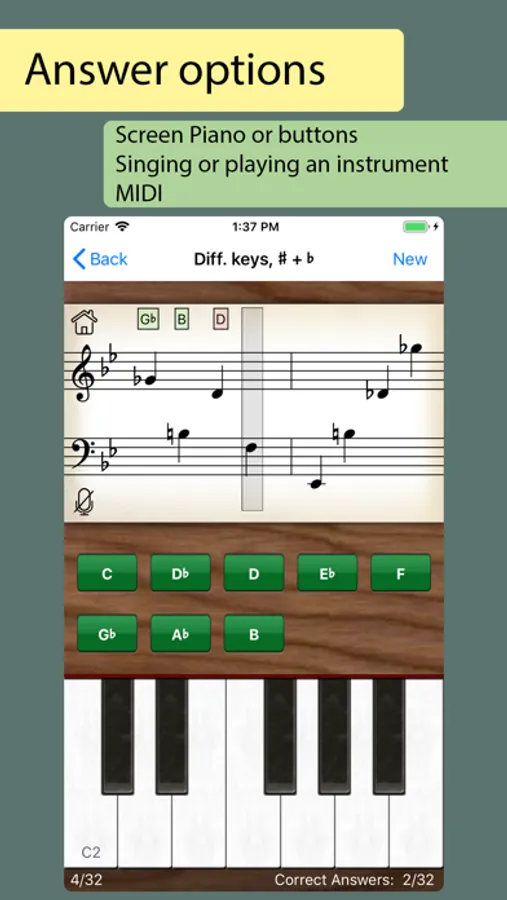 - Answer using MIDI device (*), virtual piano or answer buttons