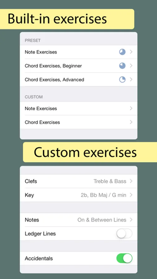 Exercise levels range from beginner to advanced. Note Trainer will guide you and recommend exercises to help you gradually improve your skills. More advanced users can focus on different areas of the application or select to start training at a higher level.