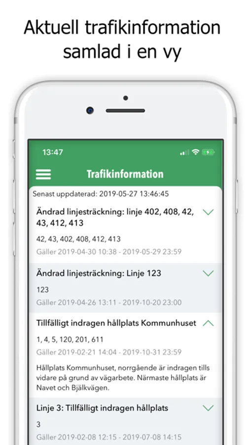 Funktionen Trafikinformation rapporterar om eventuella trafikstörningar eller förseningar.