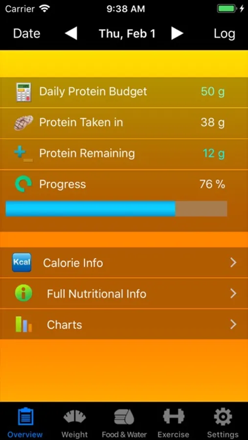 The protein counter also enables you to track calorie and water intake as well as exercise and weight history.