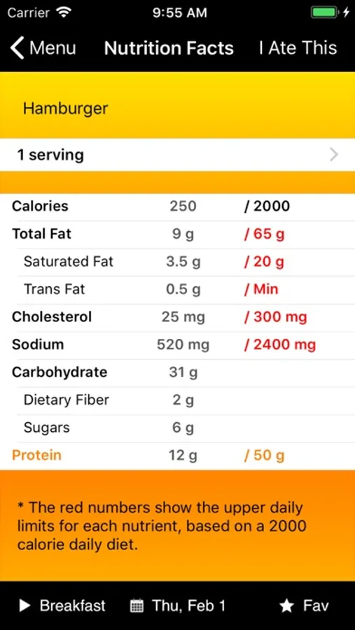 * Nutritional facts including Protein, Calories, Total Fat, Saturated Fat, Trans Fat, Cholesterol, Sodium, Carbohydrate, Dietary Fiber, and Sugars