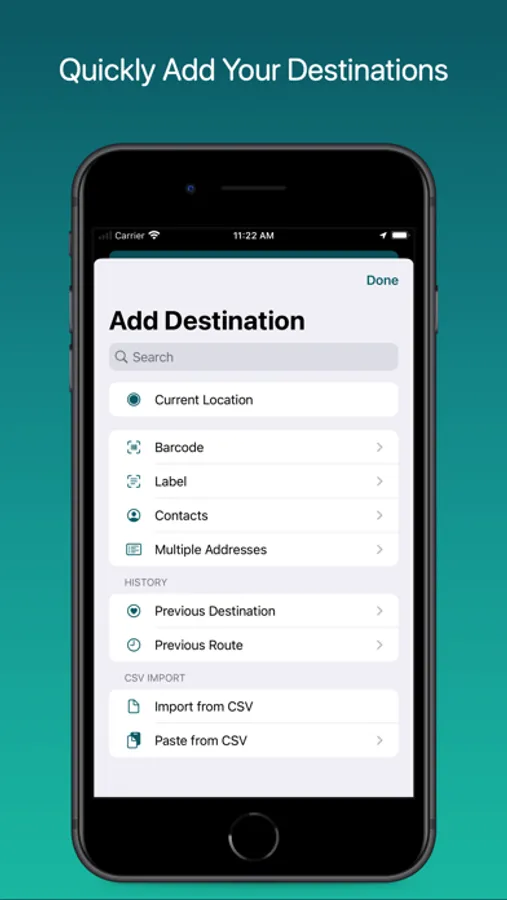 Scan a barcode, search for addresses, add from contacts, add from a previous route or your current location, paste a list or import a CSV file.