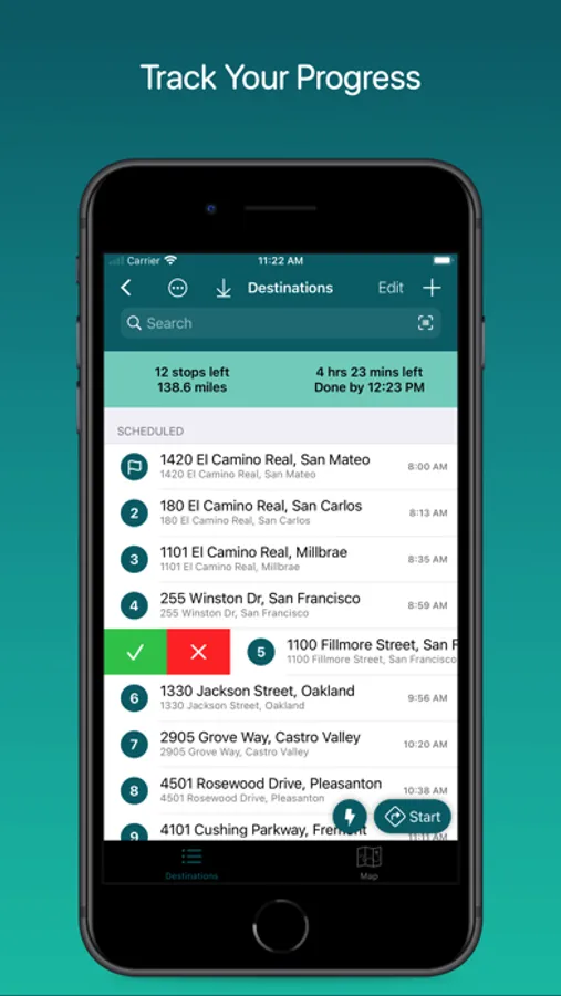 You can mark each destinations as Success or Failed. Set a different color on markers. The Estimated Arrival Time will update as you progress through your day.