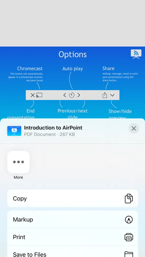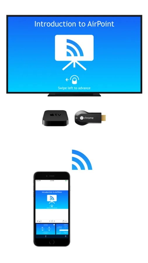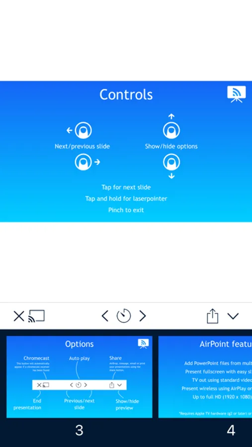 AirPoint is an application for casting PowerPoint presentations from your iDevice to projectors and flatscreen displays using Apple TV or Chromecast. The main features of the application are: