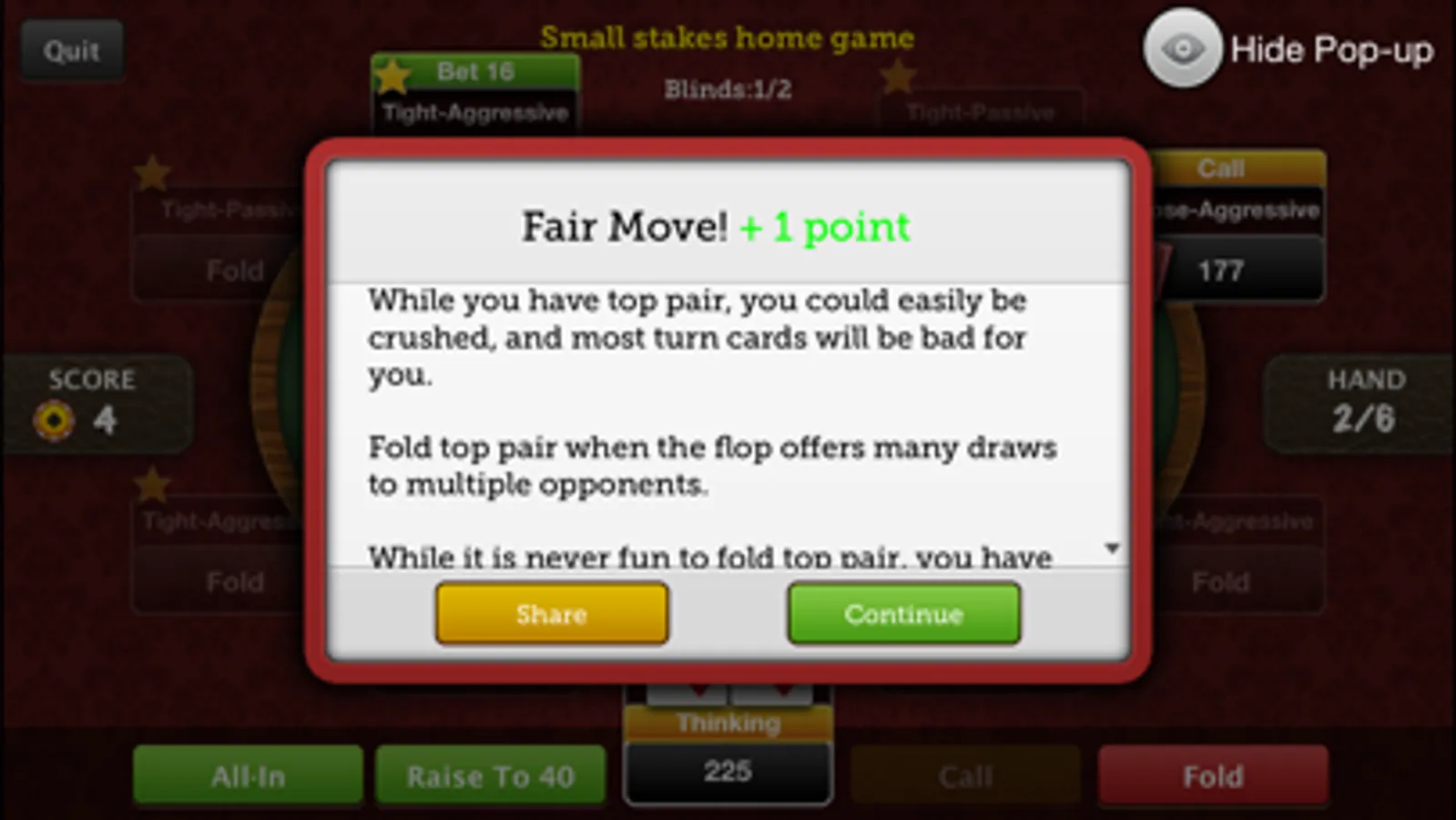 Make the “Best Move,” and you are awarded +3 ProCoins. Make a “Good Move” or “Fair Move” and you’ll earn +2 or +1 ProCoins, respectively. Make a “Bad Move,” and well, zero points for you, but you will earn the advice of the pro, who will explain why it was the wrong decision and his thought process behind making the right one.