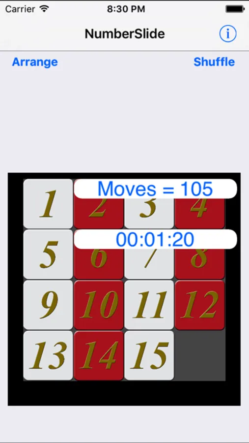 Move the numbered tiles around to get the numbers in sequence. Any sequence can be targeted, but if you order them in the numeric sequence as displayed when pressing the 'Arrange' button (after a 'Shuffle'), a special 'congratulations' appears, along with the move count and time to complete.