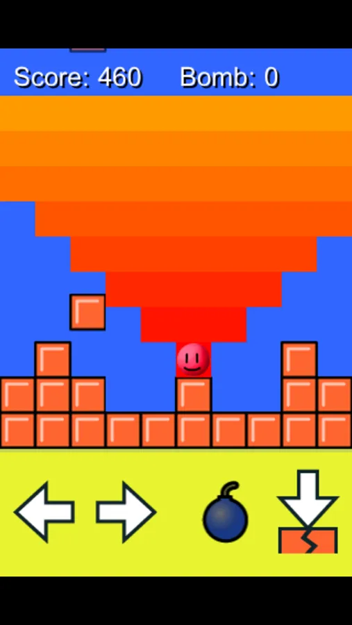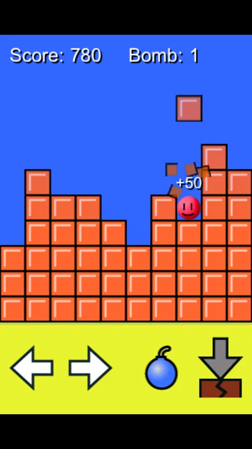 - Press BOMB button to use a bomb and clear all the blocks above him. You get a new bomb every 500 points of scores.