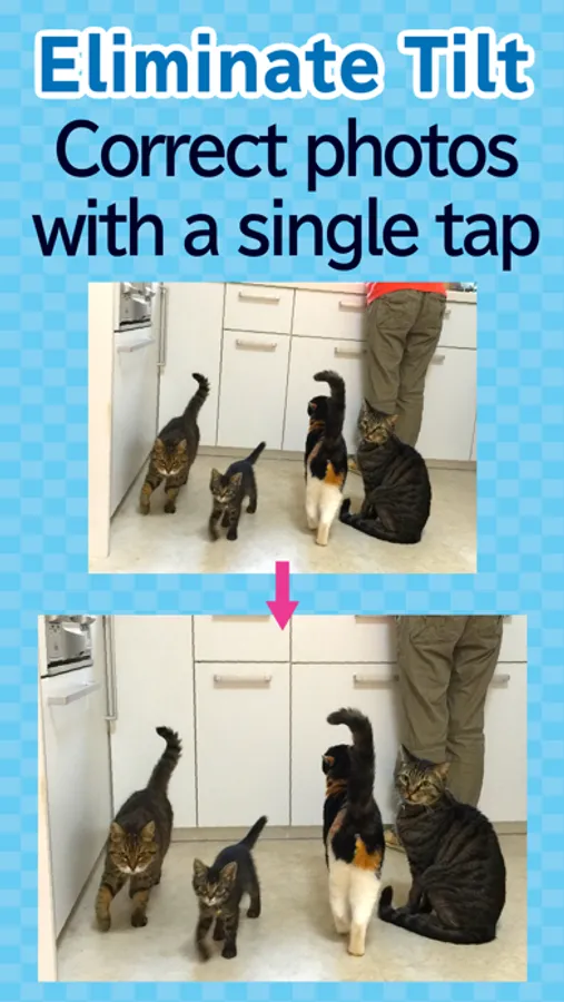 You can correct the images horizontally with Automatic Horizontal Correction feature of toruneko. Even if the iPhone is tilted during shooting, images will be corrected as if holding the iPhone horizontally.