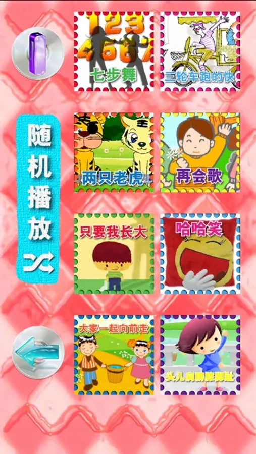 碟1:七步舞,三輪車跑的快,兩隻老虎,再会歌,只要我長大,哈哈笑,大家一起向前走,头膝盖脚趾头