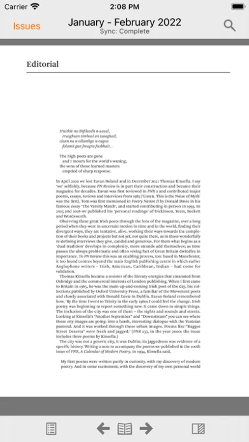 PN Review is published every two months and the iPad/iPhone edition brings you selected pages from the latest issue as soon as it is available. You can subscribe within the application for full access, which brings you every page of the issue and a searchable archive of all back issues. Issues are not sold individually - for the duration of your subscription you have access to every issue in this archive.