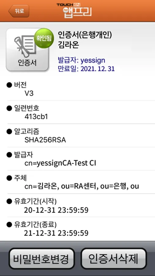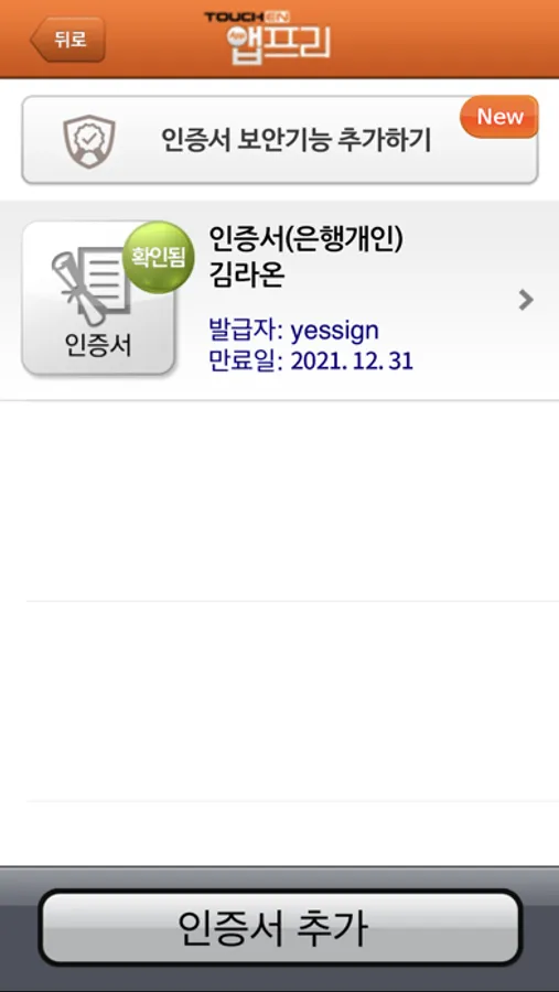 - 터치엔 앱프리(TouchEn Appfree)에 폐지된 인증서가 남아 있을 경우, 해당 인증서를 삭제하여 주시기 바랍니다.